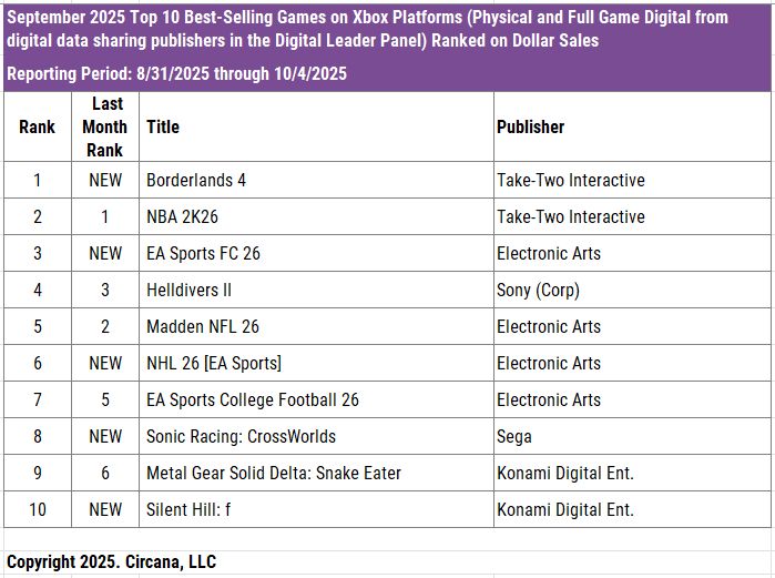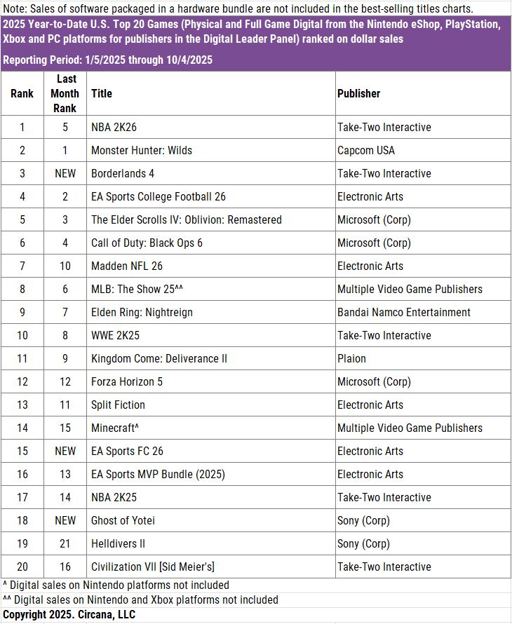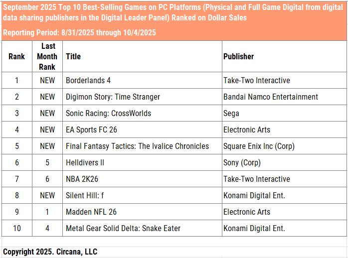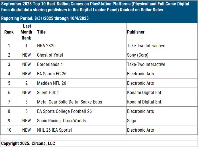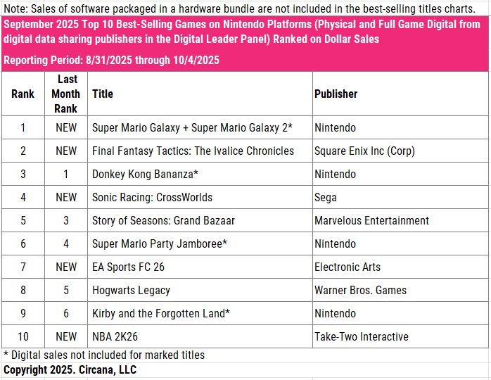 O Circana (ex-NPD) liberou o ranking de venda de jogos nos EUA, com base em pesquisas realizadas na maior parte das grandes distribuidoras do país em setembro de 2025.