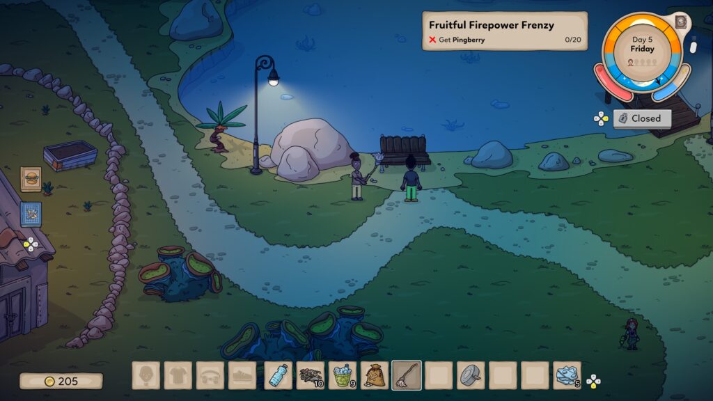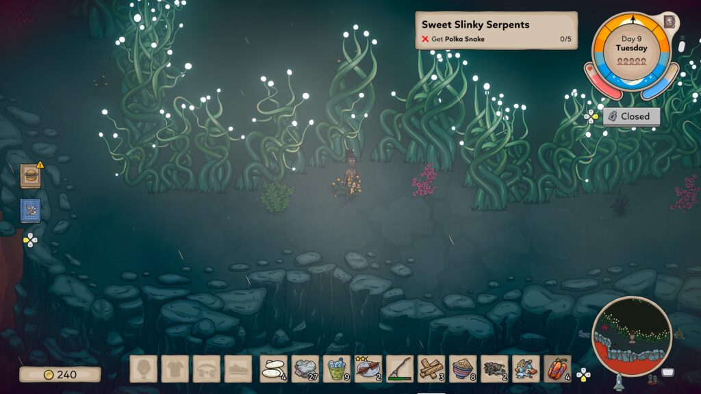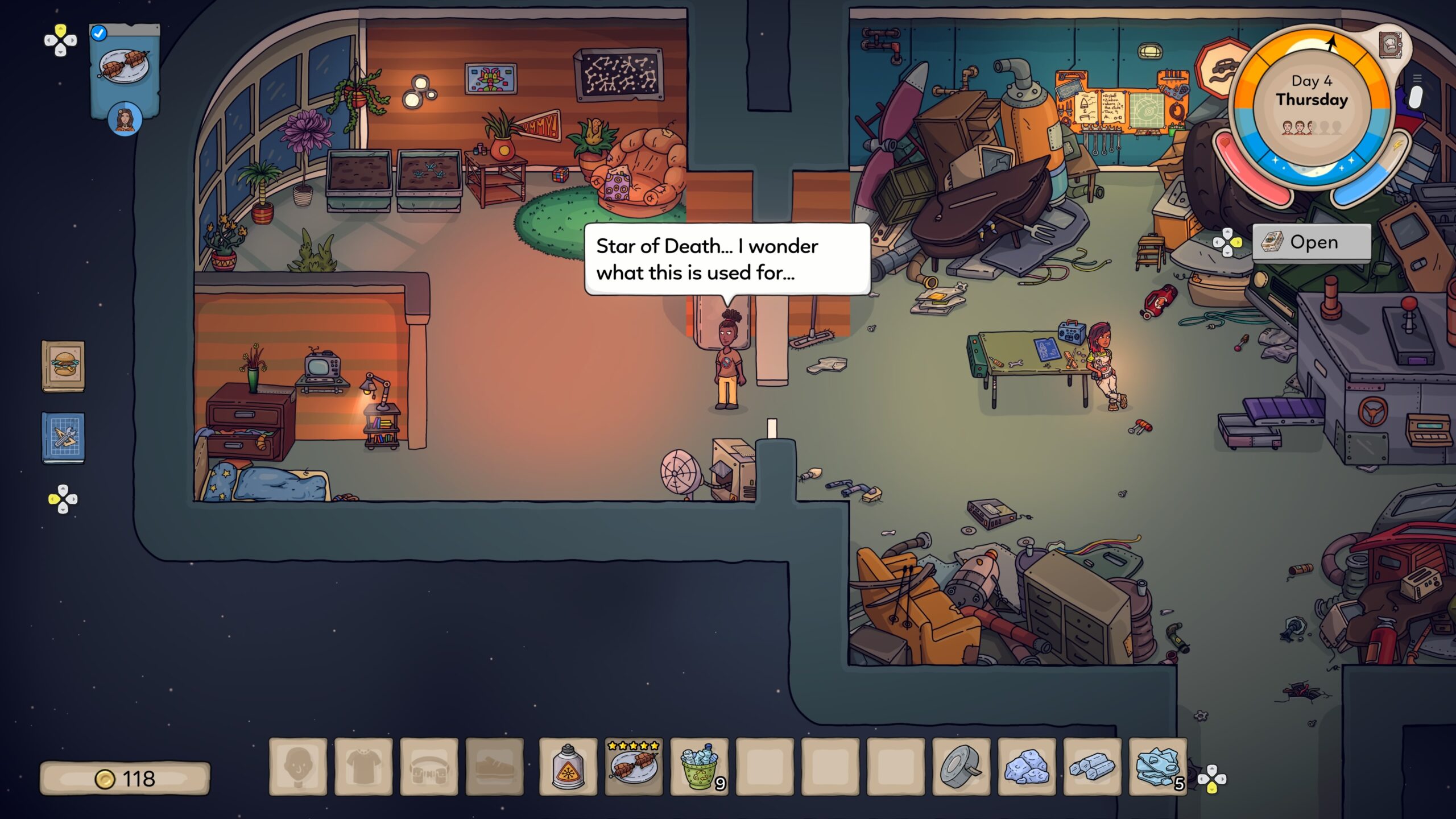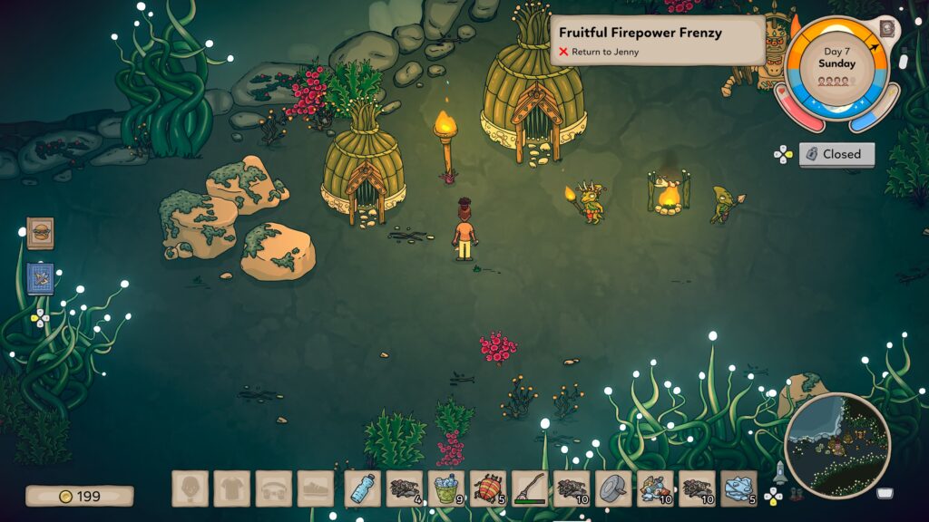 O resultado é que no tutorial, aprendemos que sucata é importante, vale a pena coletar para vender ou reciclar em materiais mais refinados; que vários ingredientes para a cozinha são ótimos para receitas diversificadas; que ter ferramentas como pá, faca e espátula é fundamental para todo tipo de caça e colheita… mas logo depois descobrimos que vai faltar muito espaço para lidar com esta diversidade de ações ao mesmo tempo.