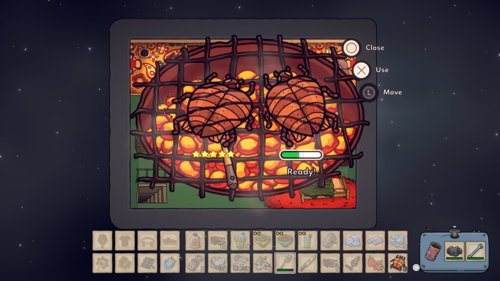 O exemplo mais direto é o primeiro prato que aprendemos, que demanda que capturemos umas baratas enormes no próprio trailer onde vivemos. Espanque-as com a espátula e as leve para a cozinha, o que é bastante natural para o tom adotado pelo jogo. Aí, na churrasqueira improvisada com um latão e carvão, temos um minigame de precisão que lembra coisas como Overcooked e até mesmo Super Mario Party Jamboree. Perfeito.