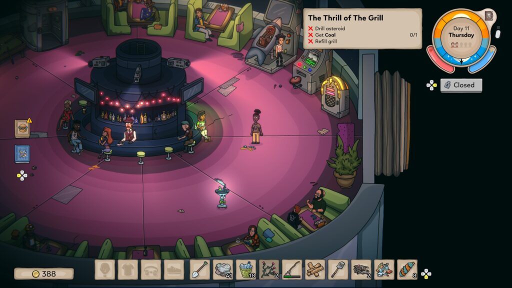 Isso significa que essa vida será cheia de atividades, como visitar planetas para coletar ingredientes raros e deliciosos (são cinco deles, bem diversos entre si, disponíveis no jogo), descobrir novas receitas conforme vai aprendendo a lidar com clientes pouco ortodoxos, e ainda achar tempo para coletar tralhas que serão de grande ajuda na criação de ferramentas, mobília e itens bastante úteis a médio e longo prazo.