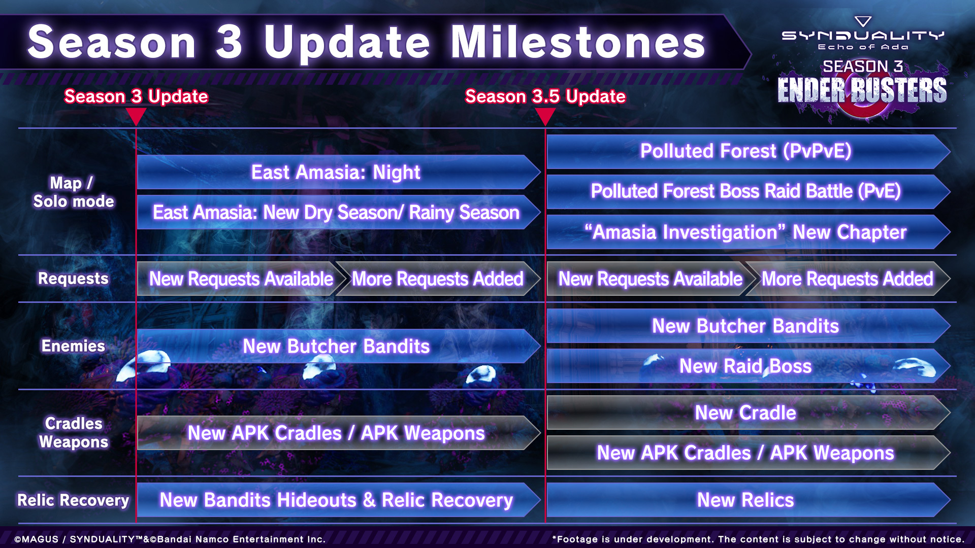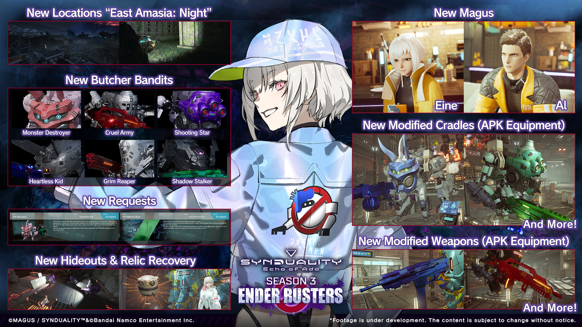 Já disponível, a temporada com nome de “Ender Busters” oferece novas áreas (East Amasia: Night), novos tipos de Bandits, novos Requests, novas Relics, novos Magus e novas armas e Cradles modificados.