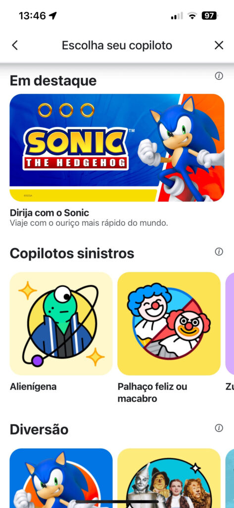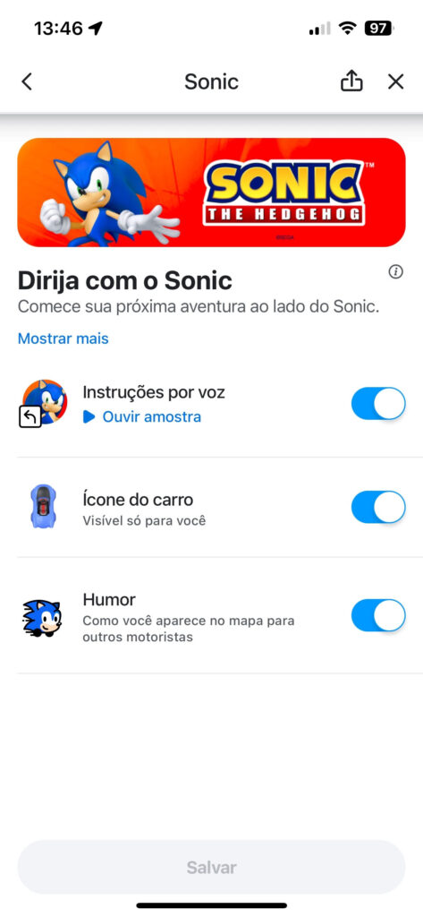 Para acessá-la, basta ir em “escolha seu copiloto” e selecionar o banner do personagem. Lá, haverá a opção de mudar para a voz do personagem, alterar o ícone do carro e ativar uma opção de humor. Lembrando que todos os comentários de Sonic estão em inglês.